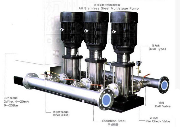 運用當今最先進的微電腦控制技術,將變頻調速器與電機水泵組合而成的機電一體化高科技節能供水裝置。變頻恒壓供水設備以水泵出水端水壓(或用戶用水流量)為設定參數,通過微機自動控制變頻器的輸出頻率從而調節水泵電機的轉速,實現用戶管網水壓的閉環調節,使供水系統自動恒穩于設定的壓力值。