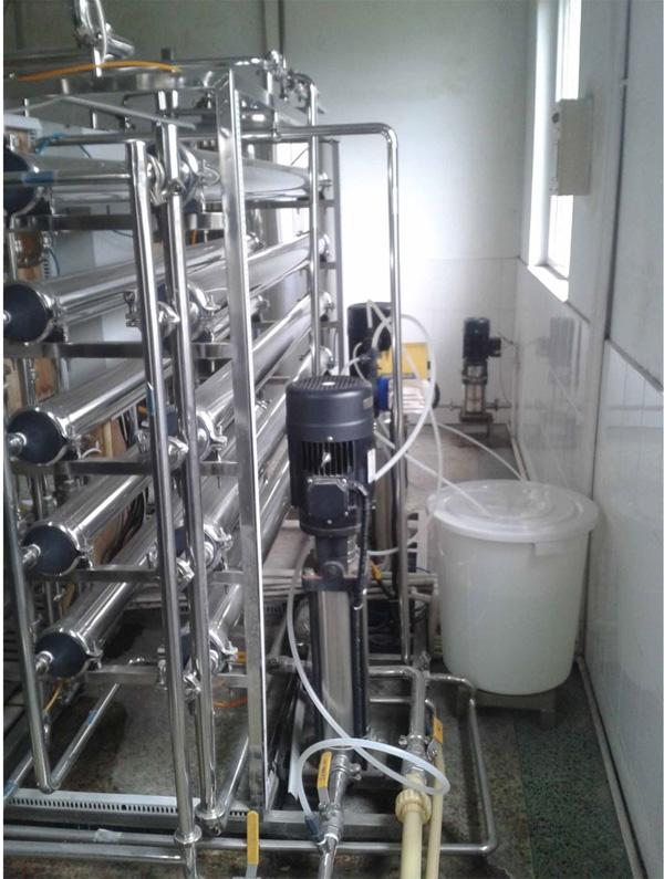經過預處理后合格的原水進入置于壓力容器內的膜組件,水分子和極少量的小分子量有機物通過膜層,經收集管道集中后,通往產水管再注入反滲透產水箱。反之不能通過的就經由另一組收集管道集中后通往濃水排放管,排入反洗水箱中或排出系統之外。系統的進水、產水和濃水管道上都裝有一系列的控制閥門,監控儀表及程控操作系統,它們將保證設備能長期保質、保量的系統化運行。